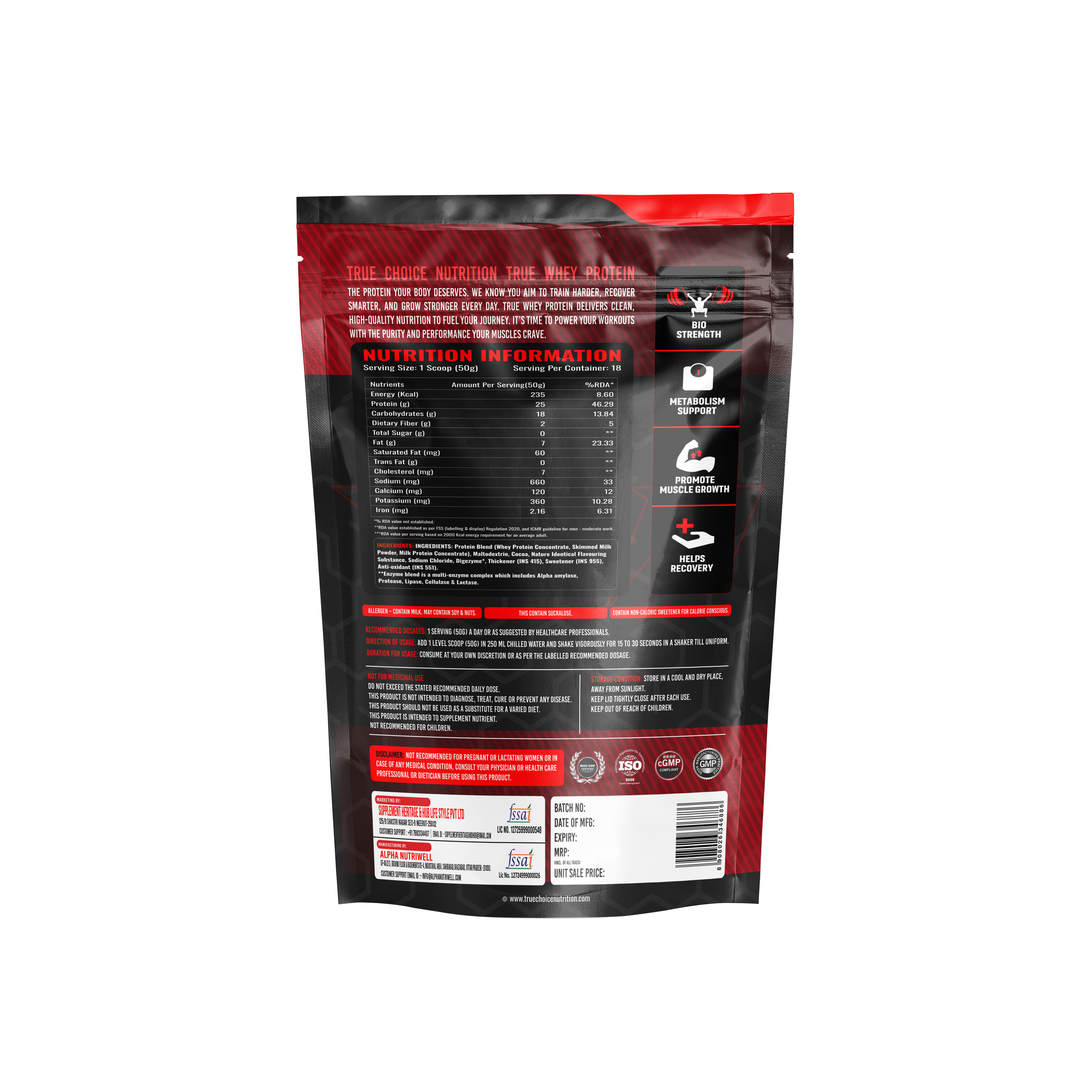 TCN True Whey Protein delivers 25g of pure whey protein per serving, engineered to support muscle recovery and lean mass development. This 900gm container provides approximately 30 servings of rich chocolate flavor that mixes smoothly without grittiness. Formulated with fast-absorbing whey isolate and concentrate blend, it supports post-workout protein synthesis when combined with resistance training. Free from artificial sweeteners and fillers, each serving offers complete amino acid profiles including all nine essential amino acids. Ideal for athletes, fitness enthusiasts, and anyone seeking convenient daily protein supplementation.